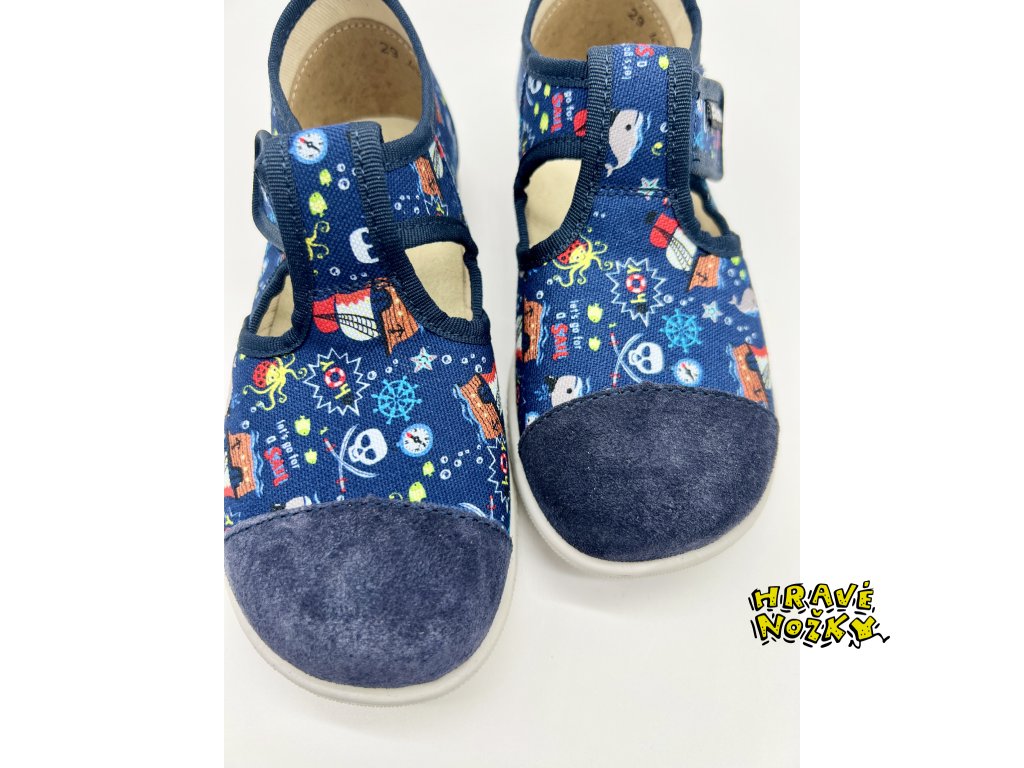 Lehká a ohebná podešev, opatek zpevněný kůží, zapínání na suchý zip podrží nožičku ve správné pozici při chůzi. Kožená plná špička je výhodou pro akční děti.