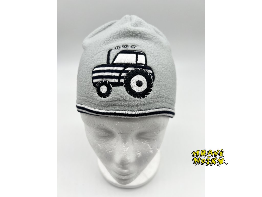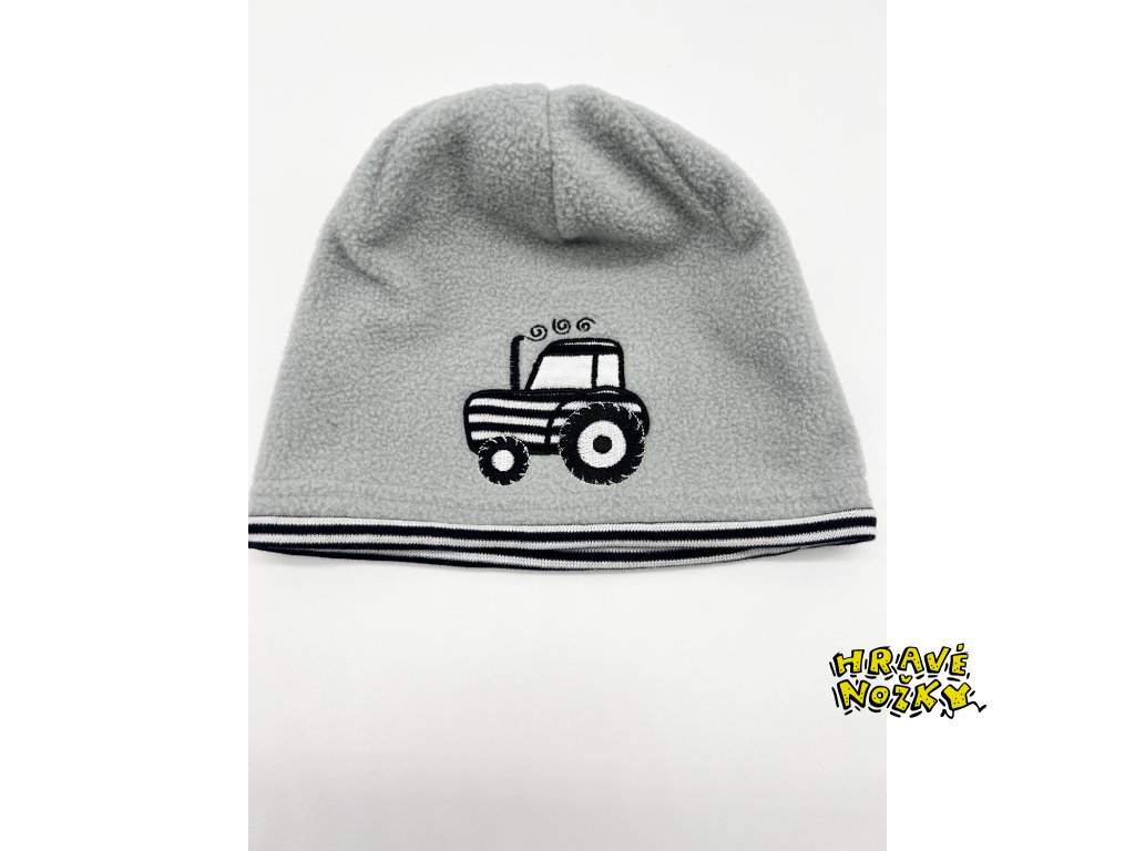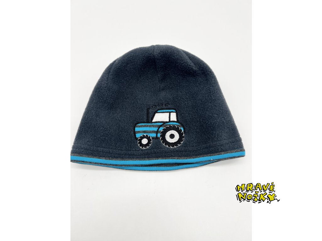 Čepice je fleecová, jednovrstvá s pleteninovým rantlem a nášivkou traktoru.