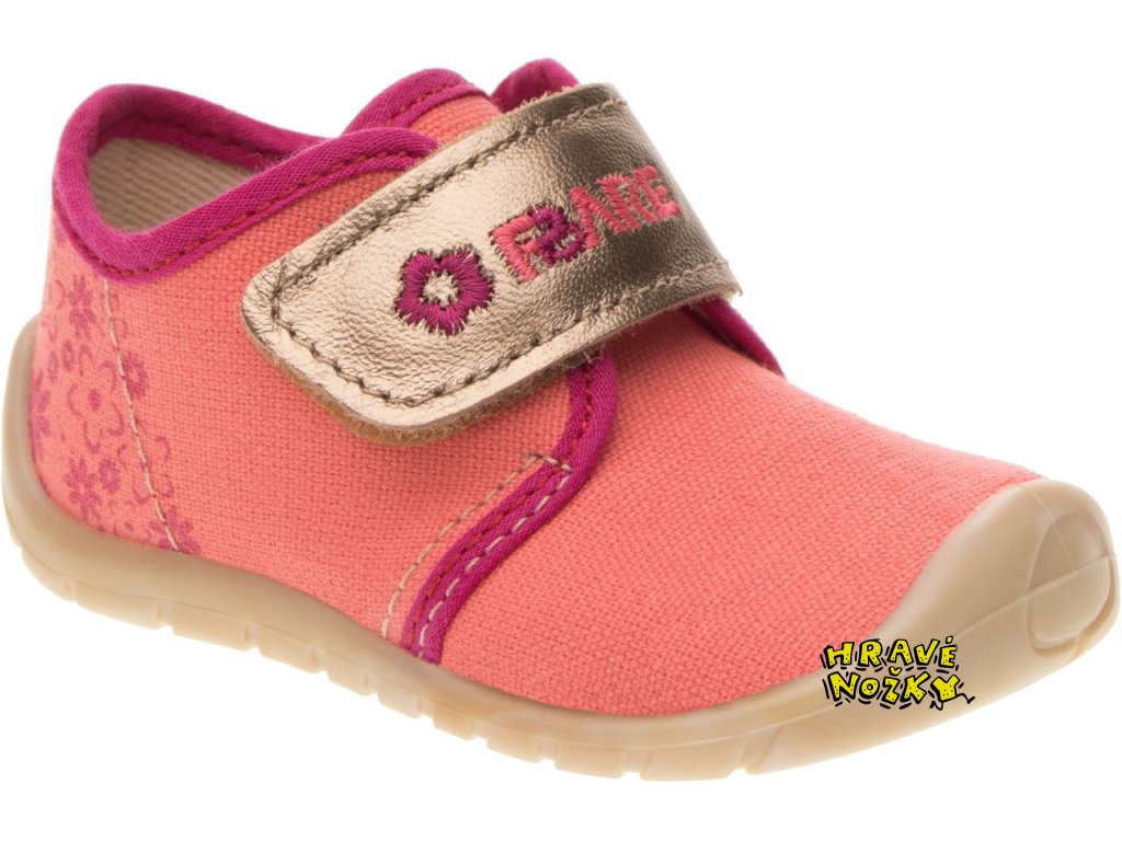 Dětská štróblovaná obuv na suchý zip. Našívací (štróblovaná) stélka umožňuje lepší ohyb boty. Vrchový materiál: textil. Podšívka: bez podšívky. Podešev je vyrobena z termokaučuku, který je velmi flexibilní. Tato obuv je proto velmi ohebná nejen příčně, ale i podélně.